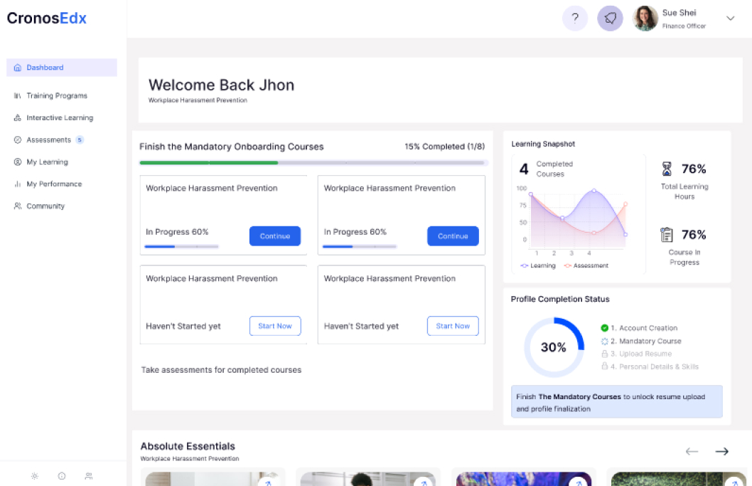 Once onboarded, every employee undergoes a diagnostic assessment that maps their current knowledge against the requirements of their role. Cronos identifies the gaps — then generates a personalised learning path to close them.